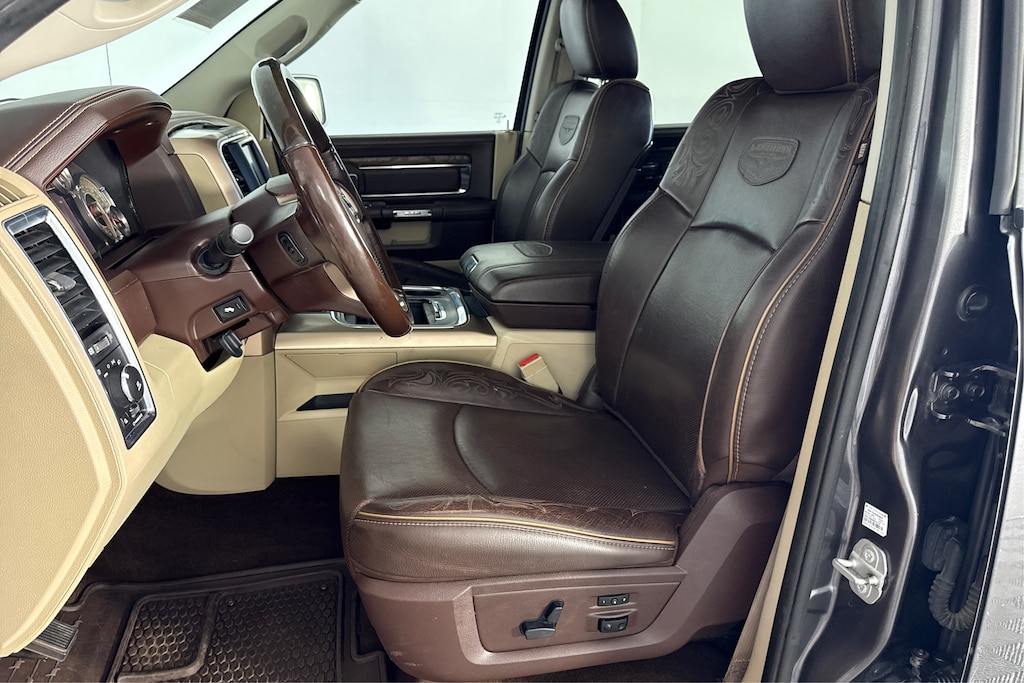 POWER SUNROOF, CHROME TUBULAR SIDE STEPS, CONVENIENCE GROUP Keyless GO®, Remote Proximity Keyless Entry, Auto High Beam Headlamp Control, Rain Sensitive Windshield Wipers, WHEELS: 20 X 9 POLISHED ALUMINUM FORGED Locking Lug Nuts, ANTI-SPIN DIFFERENTIAL REAR AXLE, TRANSMISSION: 8-SPEED AUTOMATIC (8HP70) (STD), ENGINE: 5.7L V8 HEMI MDS VVT (STD). Ram Longhorn with Granite Crystal Metallic Clearcoat exterior and Brown/Lt Frost Beige interior features a 8 Cylinder Engine with 395 HP at 5600 RPM*.